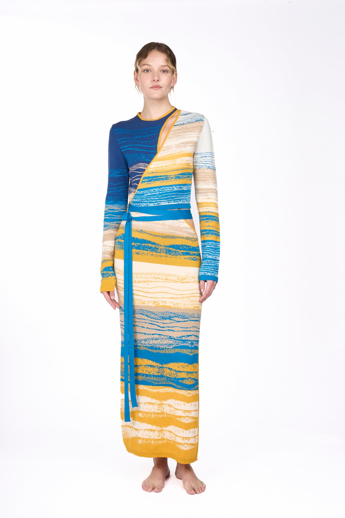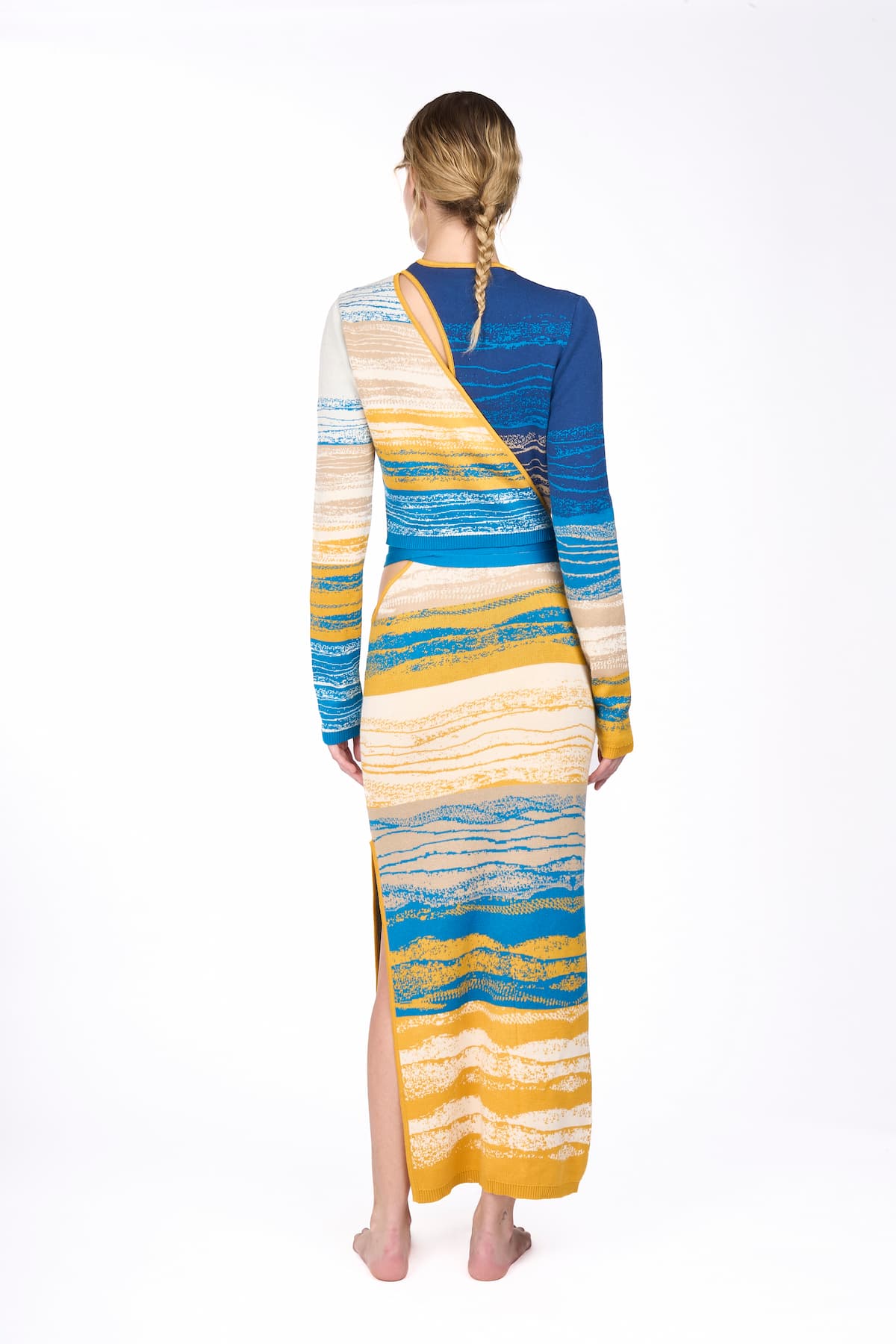 Abito lungo dall’anima artigianale, realizzato in jacquard di cotone e cashmere con dettaglio cut-out asimmetrico sul décolleté e sul fianco. Il design si compone di due pezzi combinabili il top incrociato manica lunga rifinito in costina può essere indossato insieme per un look completo o separatamente, moltiplicando le combinazioni nel guardaroba.